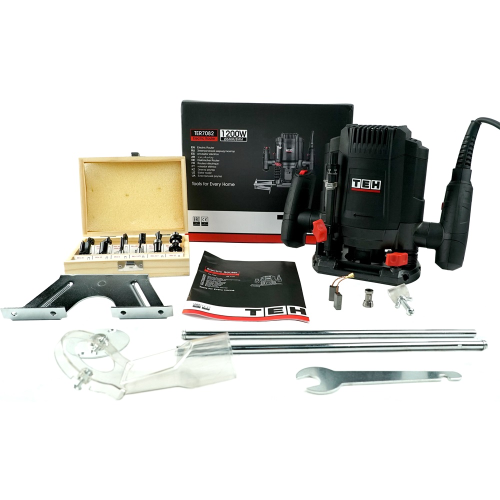 Фрезер TEH TER7082 предназначен для фрезерования (в т. ч. фигурного, по шаблону, по радиусу) различными типами фрез заготовок из дерева, древесно-стружечных плит и пластмасс, а при установке соответствующего сменного инструмента – металла. Фрезы крепятся посредством цангового зажима. Регулировка оборотов двигателя и глубины фрезерования позволяют выполнить работу с высокой точностью.