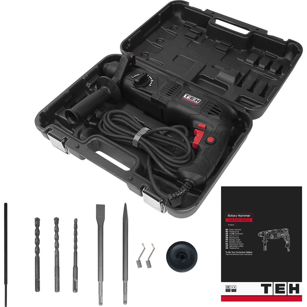 Перфоратор TEH TH3010 предназначен для бурения отверстий, штробления пазов, разрушения твердых материалов, таких как кирпич, бетон, природный и искусственный камень и т.п. В качестве рабочих насадок в перфораторе могут использоваться бур, пика, зубило.