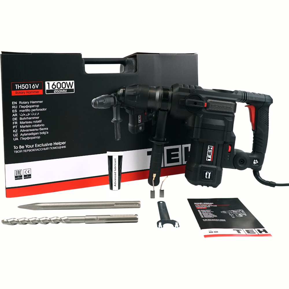 Перфоратор TEH TH5016V SDS-max предназначен для бурения отверстий, штробления пазов, разрушения твердых материалов, таких как кирпич, бетон, природный и искусственный камень и т.п. В качестве рабочих насадок в перфораторе могут использоваться бур, пика, зубило.