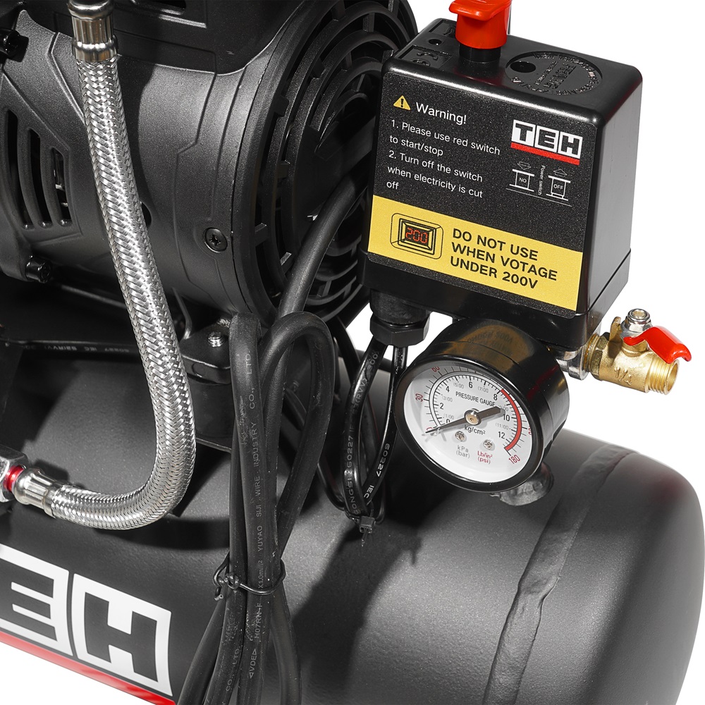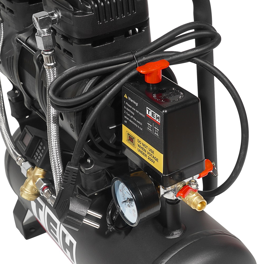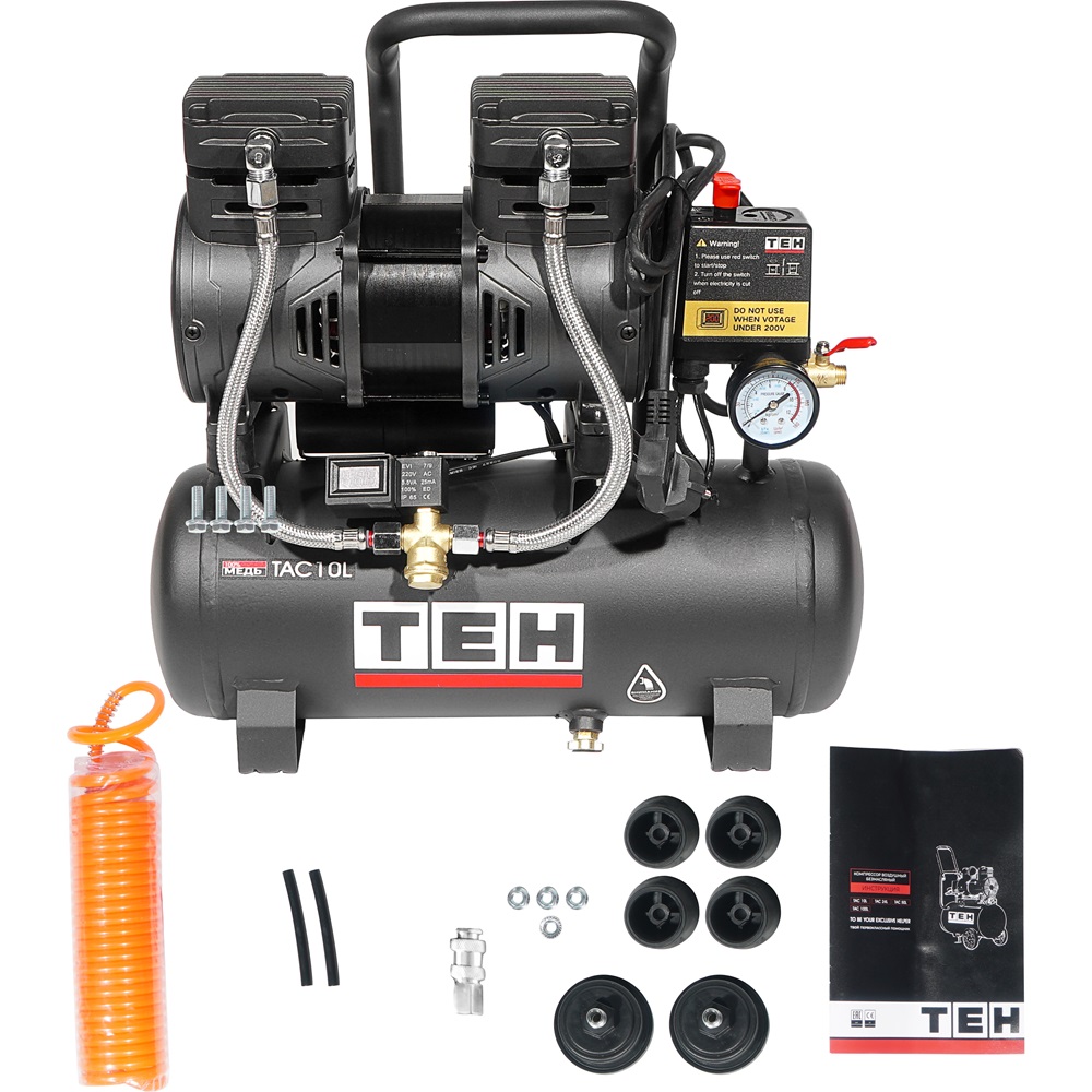 Компрессор воздушный безмасляный электрический TEH TAC10L предназначен для выработки, хранения и подачи сжатого воздуха для применения в агрегатах, использующих энергию сжатого воздуха (краскопульты, пневматические гайковерты, устройства подкачки шин и прочий пневмоинструмент). Оптимален для работы с краскопультом и для продувки электронных компонентов, т. к. в сжатом воздухе отсутствуют частицы масла. Для использования компрессора не требуется заливки масла.
